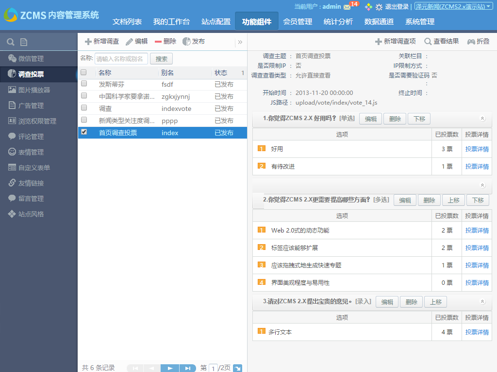 在ZCMS中,只需要经过简单的配置,就可以生成投票或者网上调查问卷,以便于网站管理人员收集用户的反馈。ZCMS支持一个调查中设立多个问题,一个问题下又可以有多个选项,选项可以是单项、多项或者手工录入项。调查支持设置允许投票的时间段;支持限制投票者IP,一个IP只允许投票一次;支持验证码,浏览者投票时必须输入正确的验证码方为有效投票。ZCMS还支持管理人员设置是否允许浏览者查看投票结果。