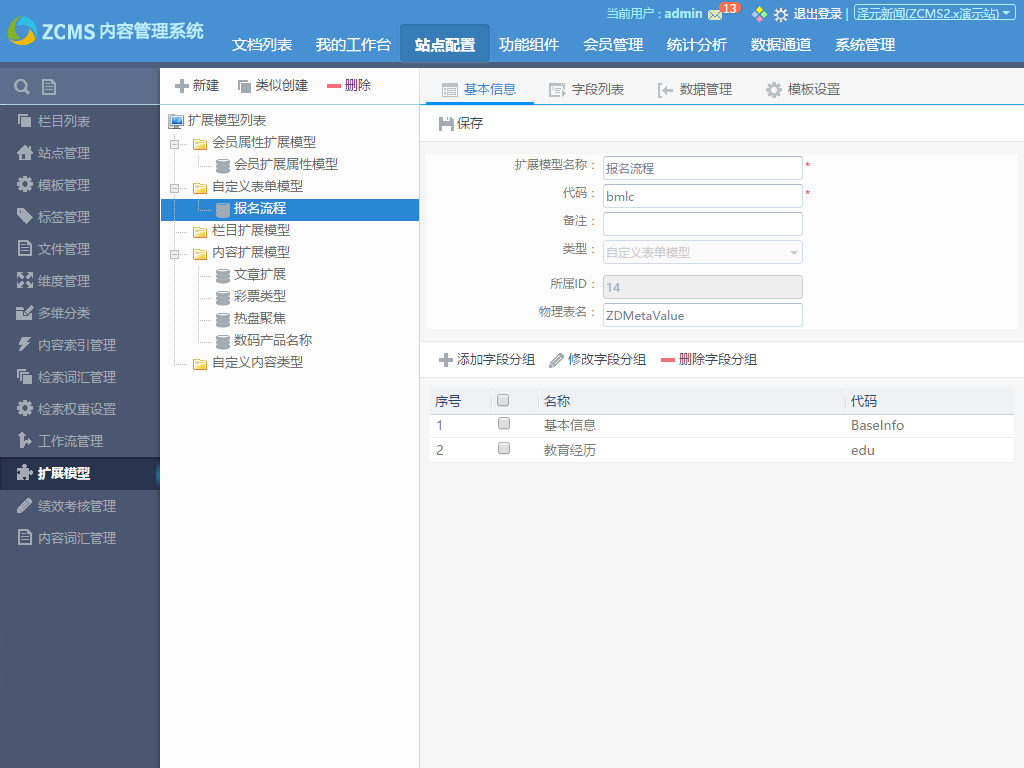 通过ZCMS的扩展模型功能,可以为自定义表单建立数据模型,并为模型设定多个字段分组。每个分组中又可以建立多个字段,每个字段有名称、代码、数据类型、控件类型、是否必填、字段可选值、校验规则、控件样式等多个属性。通过这种方式,可以为自定义表单建立非常复杂的数据结构。