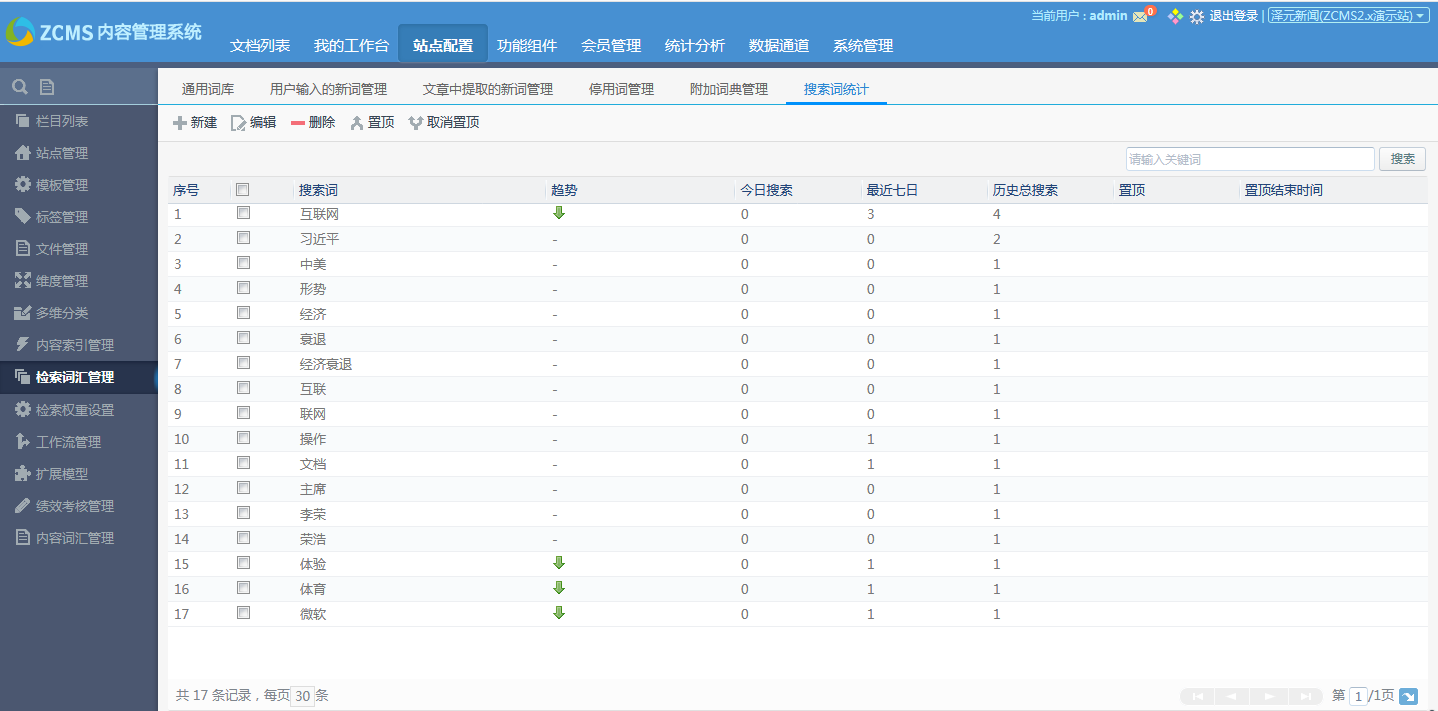 搜索词管理主要是用来管理前台页面输入的搜索词,根据搜索词的趋势、今日搜索次数、历史总次数等参数来对系统内的文档访问量进行统计。