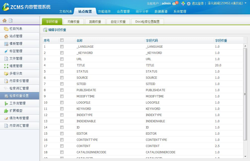 点击菜单“检索权重设置”进入检索权重设置界面,切换不同的选项卡,分别可以设置字段权重、均衡权重、距离权重、自定义权重、Docs检索位置配置。