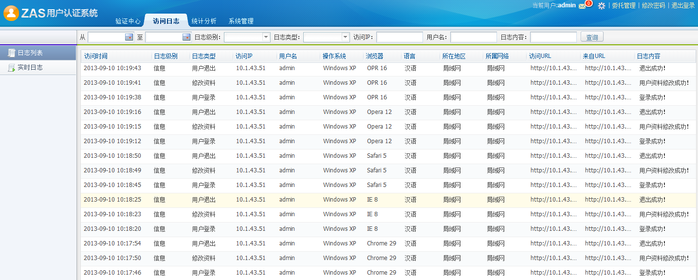 查询用户操作记录的日志信息,可以按照时间、日志级别、日志类型(用户操作类型)、访问IP、用户名、日志内容查询。