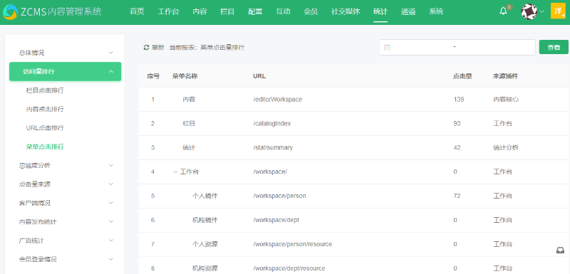 按照内容点击量排行,包括内容所属栏目、内容标题、创建者、点击量、页均停留时间。