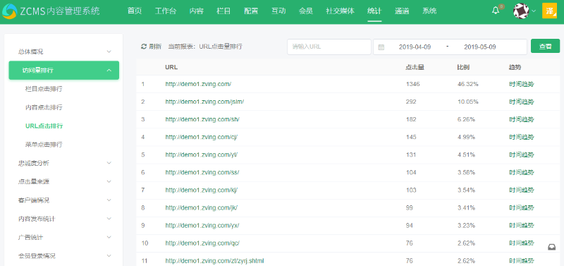 某段日期范围内,按照URL点击量排行,包括URL地址、点击量、比例、时间趋势。