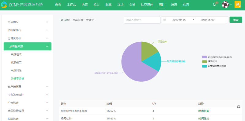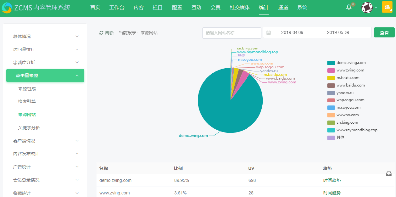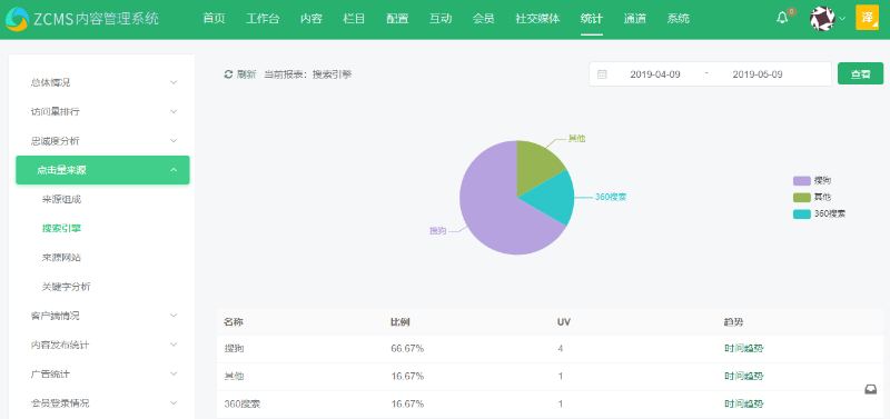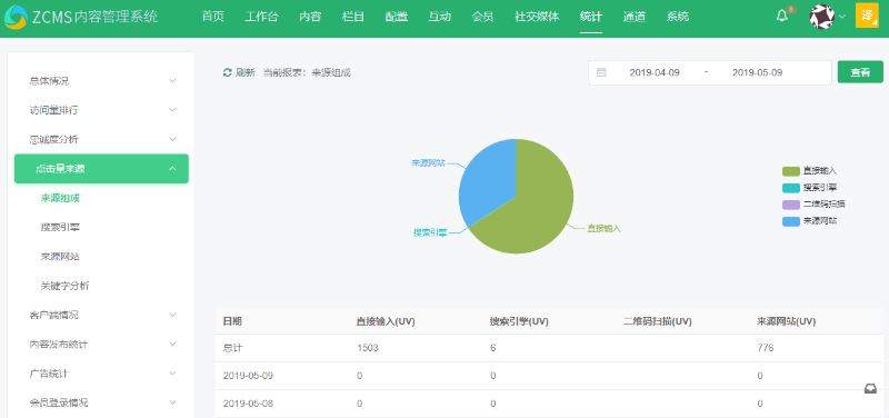 统计某段日期范围内,按照日期的倒序统计站点每天访客来源的情况,包括:直接输入UV数量、搜索引擎UV数量、二维码扫描UV数量、相关网站UV数量。