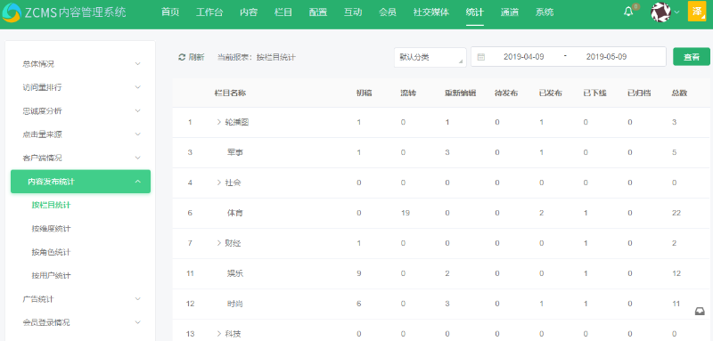 统计在某段日期范围内某栏目中内容被发布的情况,包括栏目ID、栏目名称、初稿数、流转数、重新编辑数、待发布数、已发布数、已下线数、已归档数、总数等数据。
