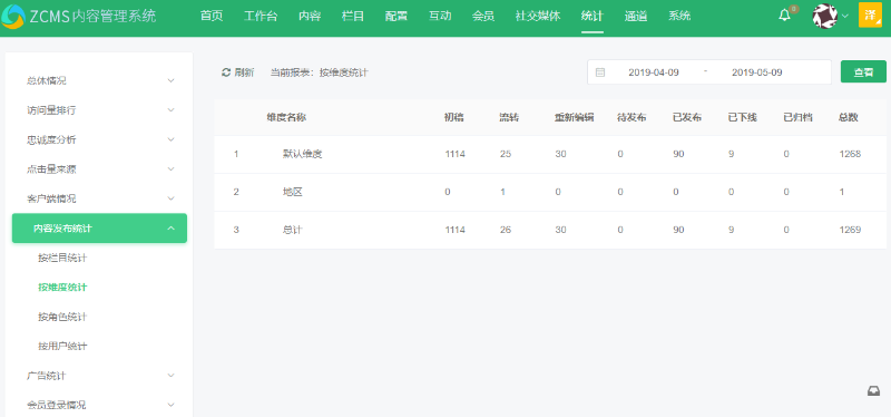 统计某个维度下每个栏目下的内容被发布的情况,包括栏目ID、栏目名称、初稿数、流转数、重新编辑数、待发布数、已发布数、已下线数、已归档数、总数等数据。