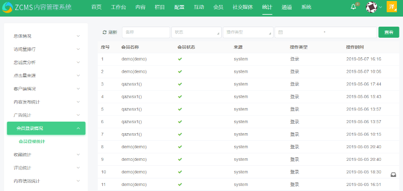 统计前台会员在某段日期内登录、退出前台站点的情况,包括:用户名、状态、来源、操作类型、操作时间点。