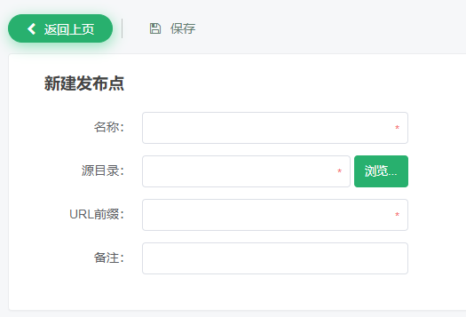 点击“新建”按钮,跳转到新建页面,输入名称、选择源目录、填写URL前缀,点击“保存”按钮,新建完成。
