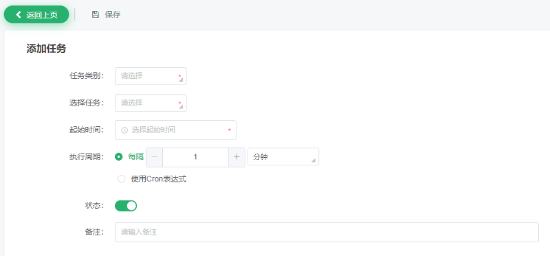新建任务:点击界面上方的“新建”按钮,跳转到新建页面,填写好信息后,点击“保存”按钮,完成新建任务。